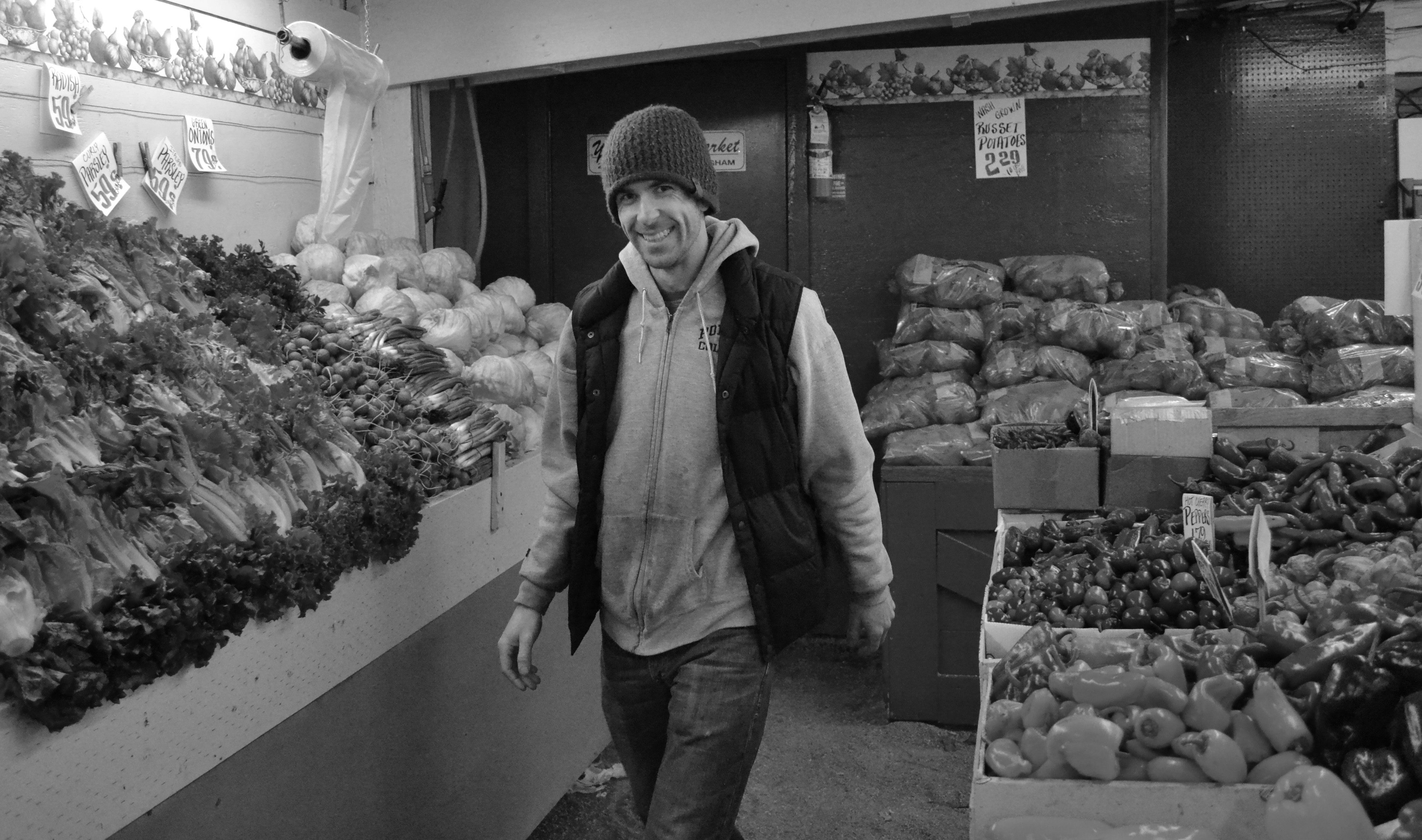 David Grote, 29, begins to stock produce at the Youngstock Nursery & Produce Market located at 2237 James St. on Wednesday, Oct. 26. Grote has worked at the market since April after moving from Boston. He graduated from Western Washington University in 2005 with a degree in psychology. He said he enjoys making use of his degree by stocking produce.